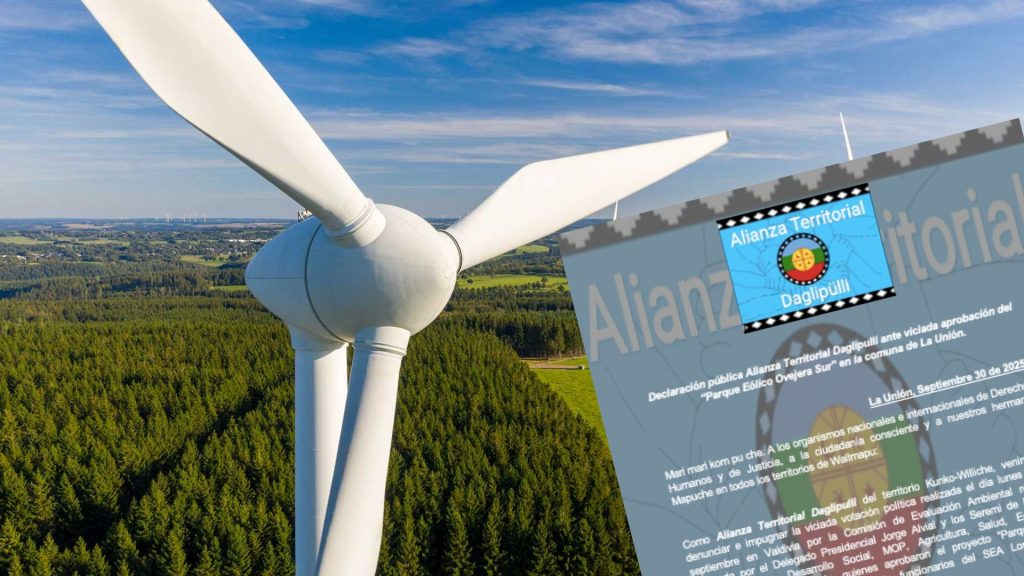 La Alianza Territorial Daglipulli del territorio Kunko-Williche emitió un comunicado público en el que denuncia y rechaza la aprobación del proyecto “Parque Eólico Ovejera Sur”, decisión adoptada el lunes 29 de septiembre por la Comisión de Evaluación Ambiental regional, encabezada por el Delegado Presidencial Jorge Alvial junto a los Seremi de Energía, Medio Ambiente, Desarrollo Social, Obras Públicas, Agricultura, Salud, Economía, Transportes, Minvu y Minería.