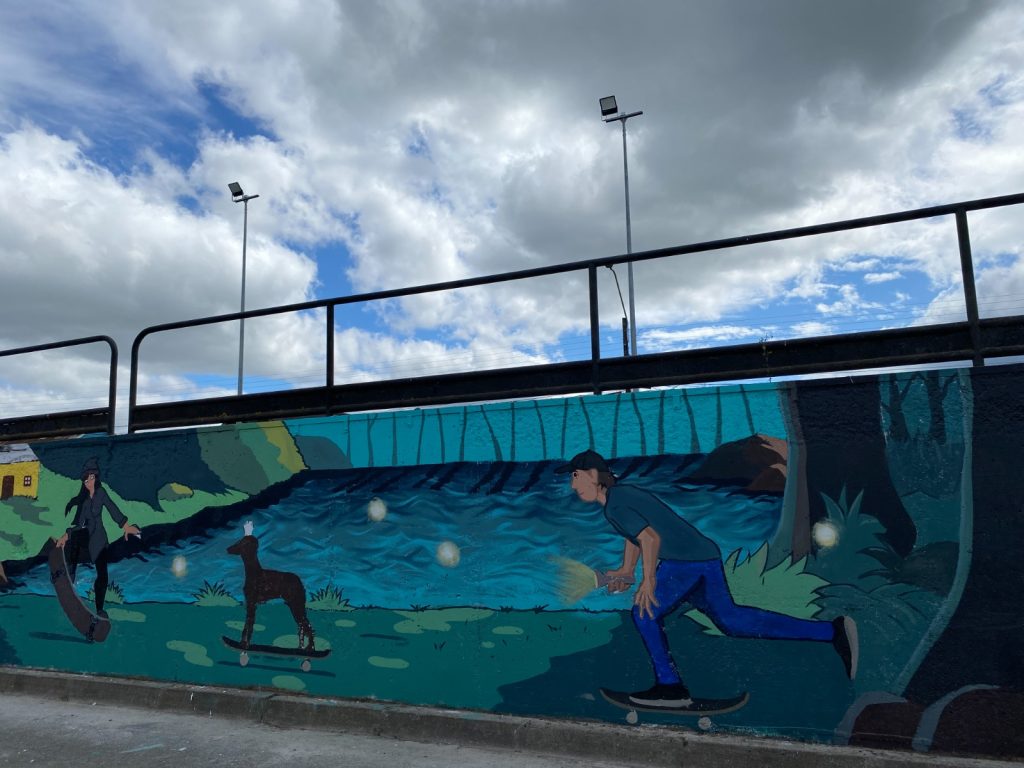 Y agregó: “Como parte del proyecto, se llevó a cabo un taller de arte urbano y muralismo liderado por el muralista Pablo Uribe, convocando a los jóvenes del barrio y de la agrupación de skatepark, quienes adquirieron habilidades técnicas y conocimientos sobre arte urbano y muralismo. Además, se realizó una mateada cultural llamada ‘Historias de mi Barrio’, en la cual se invitó a los vecinos a compartir la historia del barrio y los elementos visuales que predominan en el relato común de la comunidad, para plasmarlos en el mural, reflejando así la identidad tanto del barrio como de los jóvenes que usan el skatepark”.