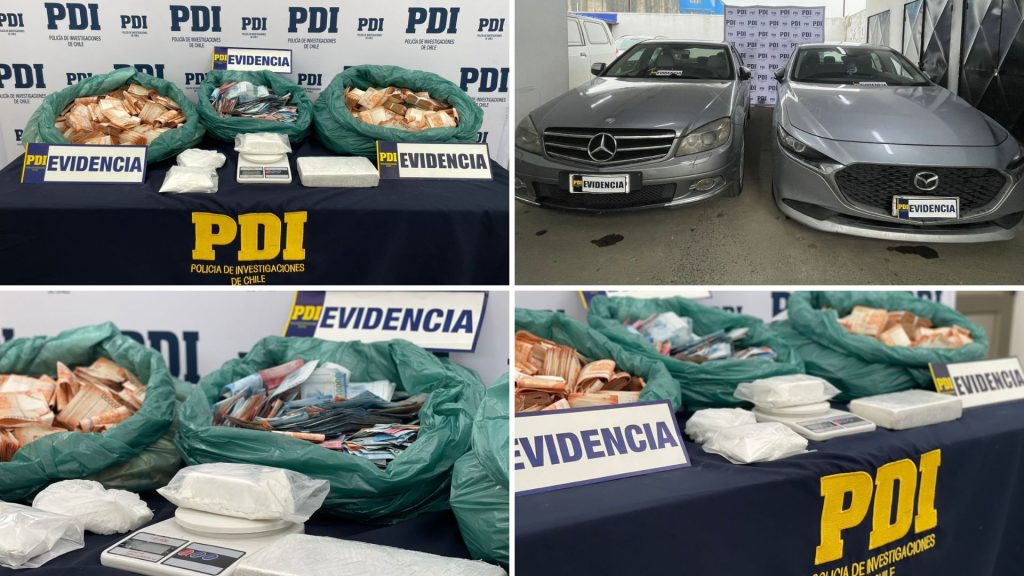 La investigación, iniciada en septiembre tras antecedentes obtenidos por la propia PDI, permitió establecer que el detenido se dedicaba al acopio, distribución y venta de sustancias ilícitas bajo la modalidad de delivery. Durante el allanamiento a su vivienda —un palafito ubicado en la ciudad— los oficiales incautaron 1.577,19 gramos de clorhidrato de cocaína, más de $354 millones en dinero en efectivo, 371 dólares, elementos de dosificación y vehículos utilizados para el delito.